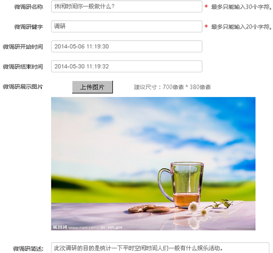 进入微调研设置界面,设置触发关键词、调研名称、开始时间结束时间、编辑图片信息,点击保存;