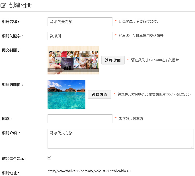 进入"创建相册"页面,设置"相册名称",“相册关键字”,上传“图文封面”、“相册封面图”图片,编辑“排序”、相册介绍,设置是否在前台显示。