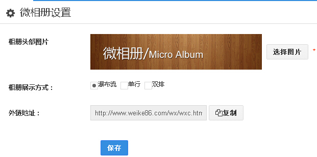 点击“微相册设置”,打开微相册设置页面,上传相册头部图片,设置相册展示方式。