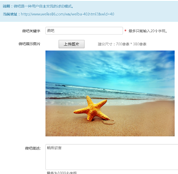1、打开“微吧设置”,编辑"微吧关键字",“微吧简述”,上传“微吧展示”图片,设置是否开启微吧。