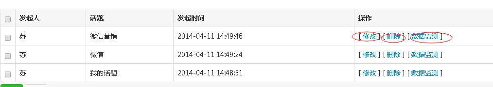 2、在我的话题管理页面,点击“修改”、“删除”按钮,可以对话题进行修改删除操作,点击“数据监测”,进入“我的话题微吧活动”页面,可以查看活动信息。