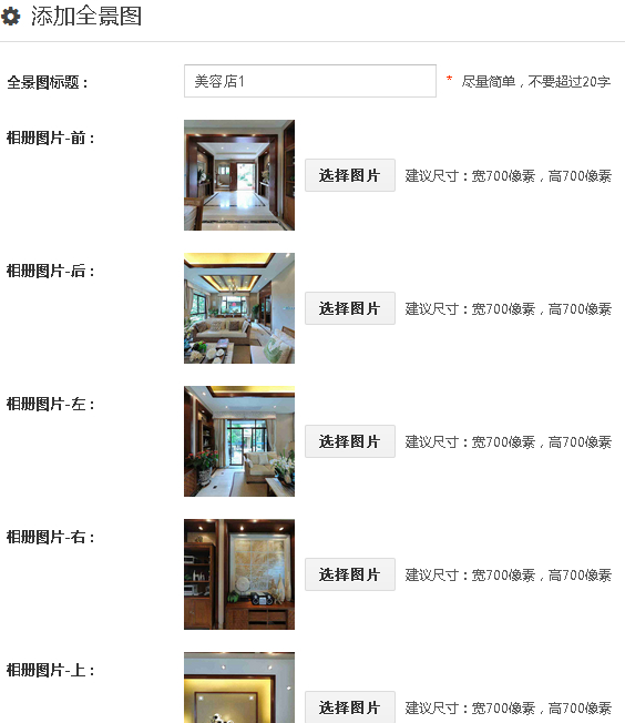 2、点击“添加全景图”,进入添加全景图界面,设置全景图标题,上传图片,保存。