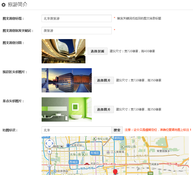 1、设置一个打开微旅游首页的触发关键字,以及图文回复的消息标题,上传图文消息封面和旅游区头部图片以及景点头部图片,在地图上设置标识;