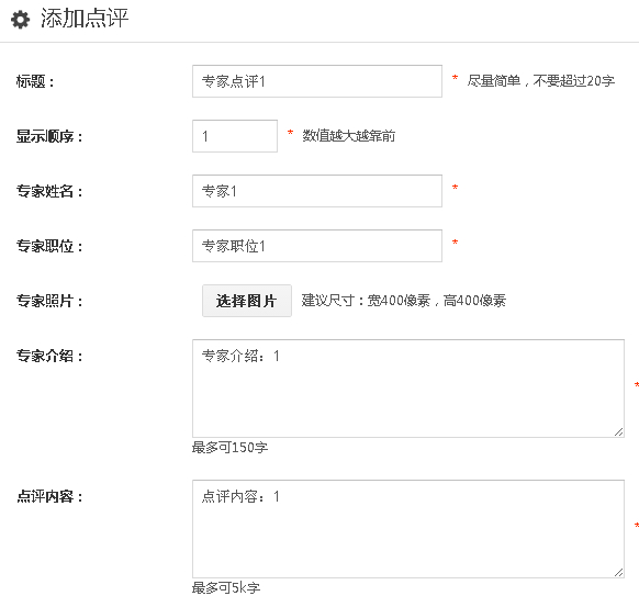 1、点击“专家点评”——“添加点评”按钮,编辑标题,显示顺序,专家姓名,点评信息等内容。