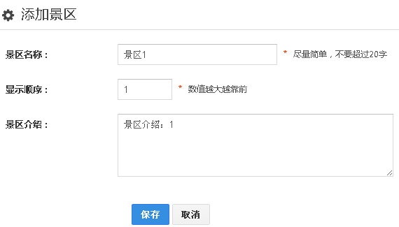点击“景区”——“添加景区”按钮,在添加景区页面中设置景区信息。