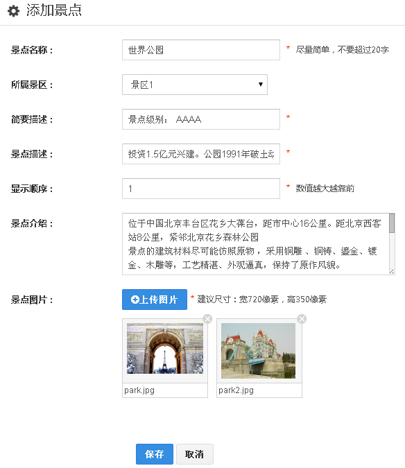 1、点击“景点”——“添加景点”,编辑景点名称,所属景区,简要描述,景点描述等等信息,上传景点图片,景点图片可上传多张。