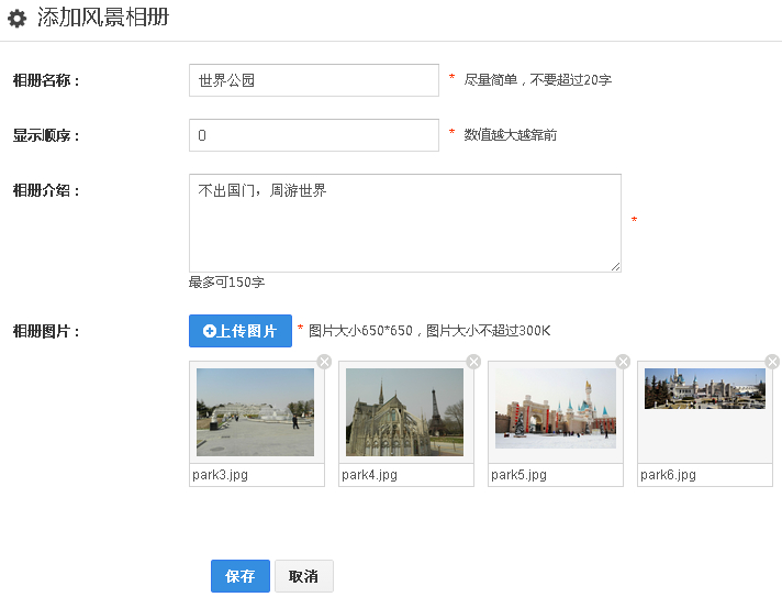 1、点击“风景相册”——“添加相册”即可添加一个新的相册,编辑相册名称,显示顺序,相册介绍,上传图片,图片可以上传多张,保存。