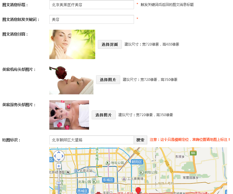 1、设置一个打开微美容首页的触发关键字,以及图文回复的消息标题,上传图文消息封面和美容机构头部图片以及美容服务头部图片,在地图上设置标识;
