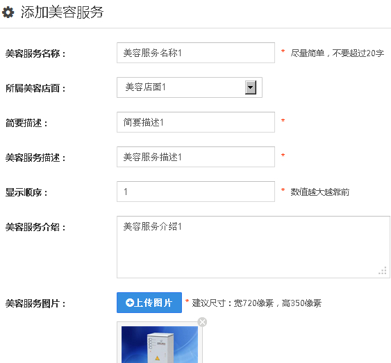 1、点击“美容服务”——“添加美容服务”,编辑美容服务名称,所属店面,简要描述,服务描述等等信息。