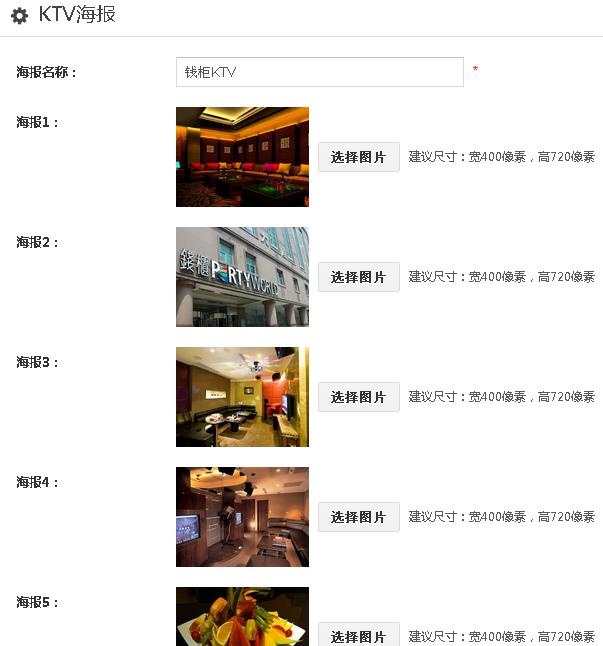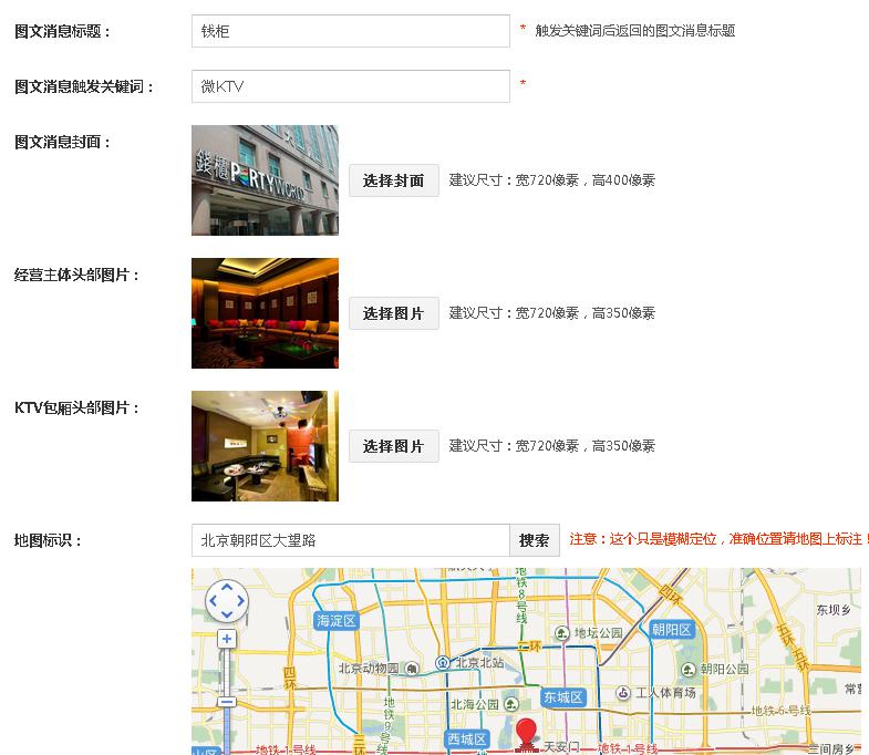 1、设置一个打开微KTV首页的触发关键字,以及图文回复的消息标题,上传图文消息封面和经营主体头部图片以及KTV包厢头部图片,在地图上设置标识;
