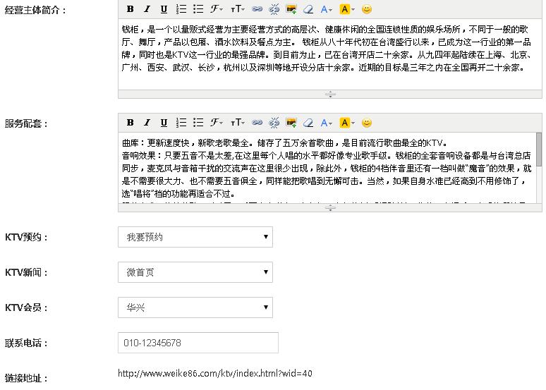 2.填写服务理念,经营主体简介,服务配套,设置KTV预约,新闻,联系电话等信息;