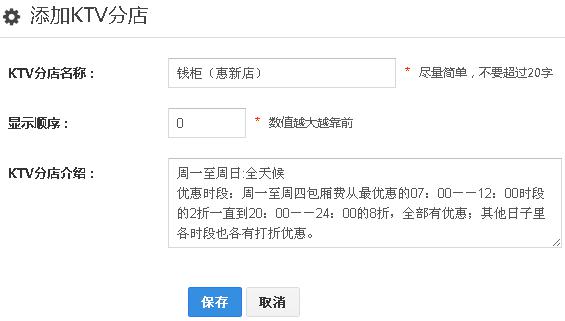 点击“KTV分店”——“添加KTV分店”按钮,在添加KTV分店页面中设置服务信息。