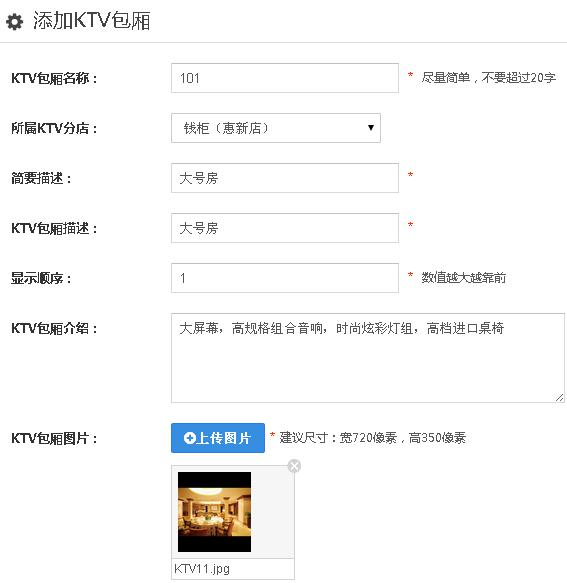 1、点击“KTV包厢”——“添加KTV包厢”,编辑KTV包厢名称,所属KTV分店,简要描述,KTV包厢描述等等信息,上传KTV包厢图片。