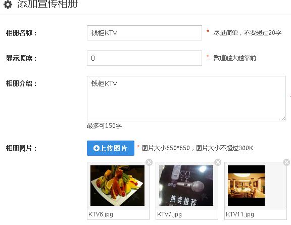 1、点击“宣传相册”——“添加相册”即可添加一个新的相册,编辑相册名称,显示顺序,相册介绍,上传图片,图片可以上传多张,保存。