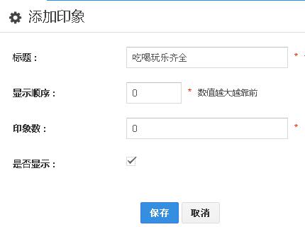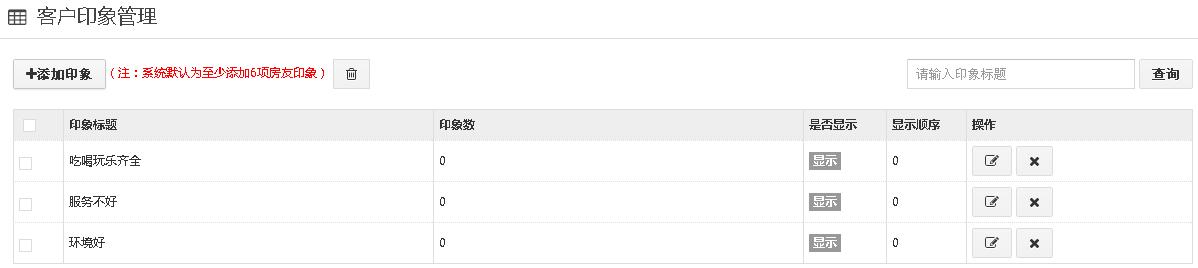 1、进入客户印象管理界面,点击“添加印象”,编辑标题,显示顺序,印象数,是否显示等信息。