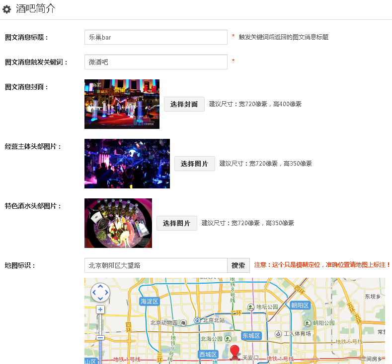 1、设置一个打开微酒吧首页的触发关键字,以及图文回复的消息标题,上传图文消息封面和经营主体头部图片以及特色酒水头部图片,在地图上设置标识;
