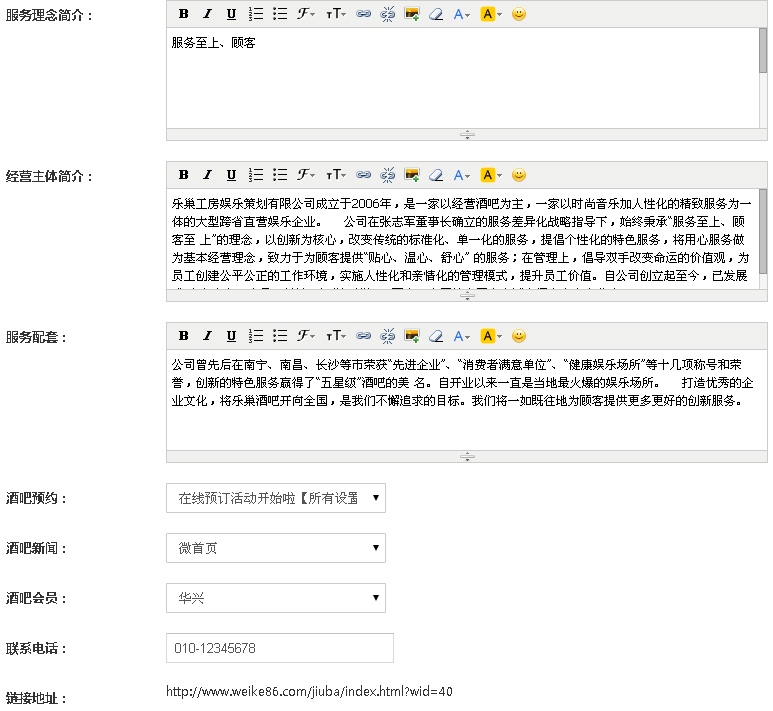 2.填写服务理念,经营主体简介,服务配套,设置酒吧预约,新闻,会员,联系电话等信息;