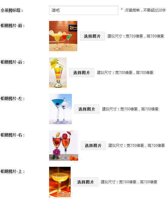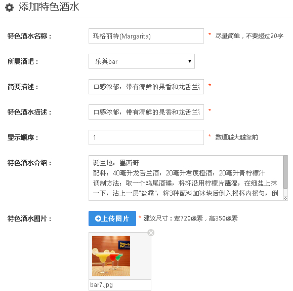 1、点击“特色酒水”——“添加特色酒水”,编辑特色酒水名称,所属酒吧,简要描述,特色酒水描述等等信息,上传特色酒水图片。
