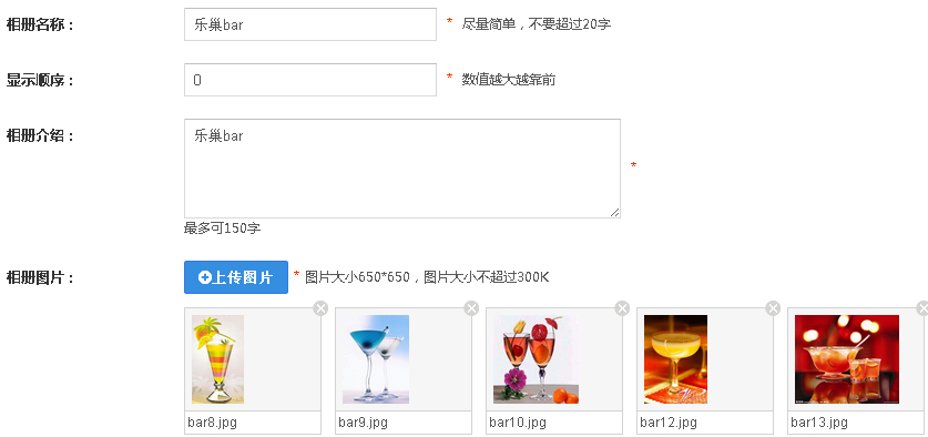 1、点击“酒吧相册”——“添加相册”即可添加一个新的相册,编辑相册名称,显示顺序,相册介绍,上传图片,图片可以上传多张,保存。