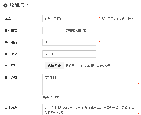 1、点击“客户点评”——“添加点评”按钮,编辑标题,显示顺序,客户姓名,点评信息等内容。
