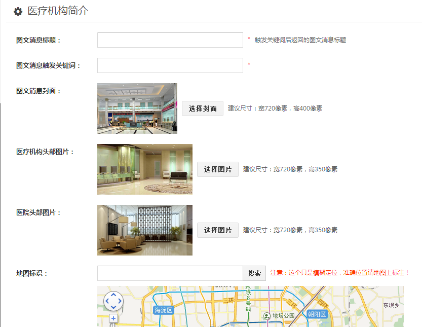 1、设置一个打开微医疗首页的触发关键字,以及图文回复的消息标题,上传图文消息封面和医院头部图片,在地图上设置标识;