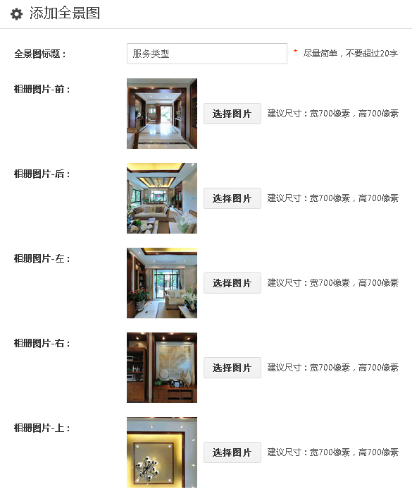 2、点击“添加全景图”,进入添加全景图界面,设置全景图标题,上传图片,保存。