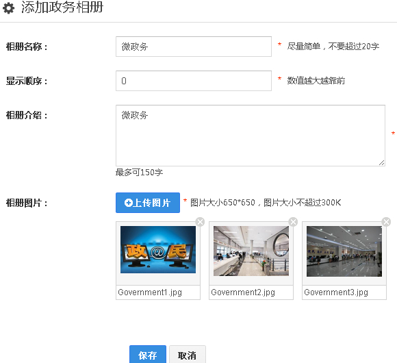 1、点击“政务相册”——“添加相册”即可添加一个新的相册,编辑相册名称,显示顺序,相册介绍,上传图片,图片可以上传多张,保存。