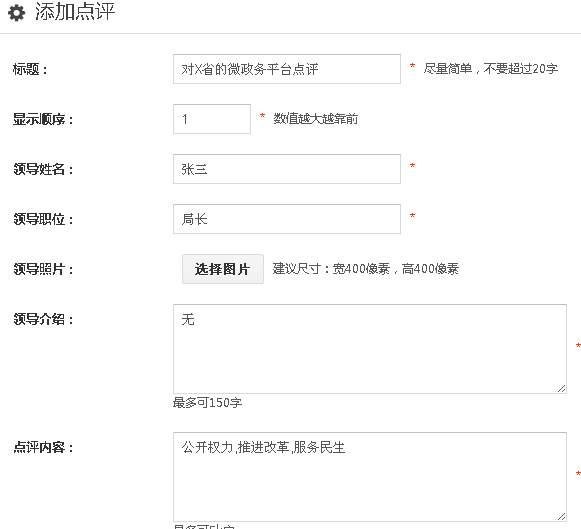 1、点击“服务点评管理”——“添加点评”按钮,编辑标题,显示顺序,专家姓名,点评信息等内容。