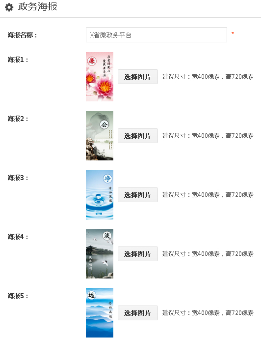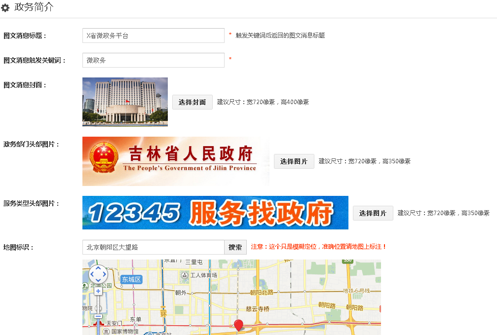 1、设置一个打开微政务首页的触发关键字,以及图文回复的消息标题,上传图文消息封面和政务部门头部图片以及服务类型头部图片,在地图上设置标识;