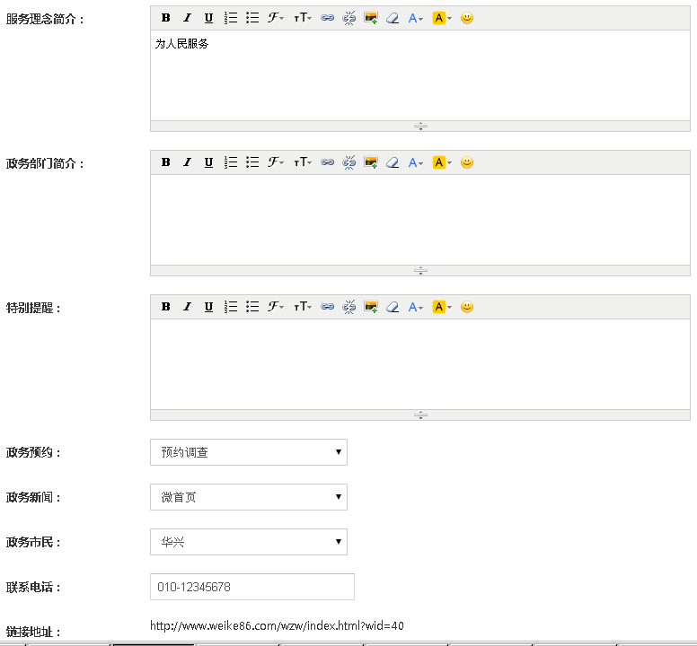 2.填写服务理念,政治部门简介,特别提醒,设置政务预约,政务新闻,联系电话等信息;
