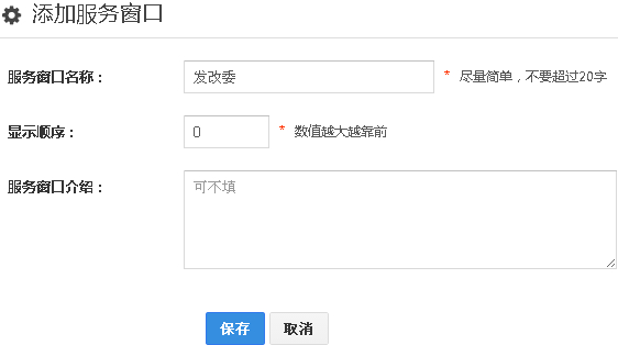 点击“服务窗口”——“添加服务窗口”按钮,在添加服务窗口页面中设置服务信息。