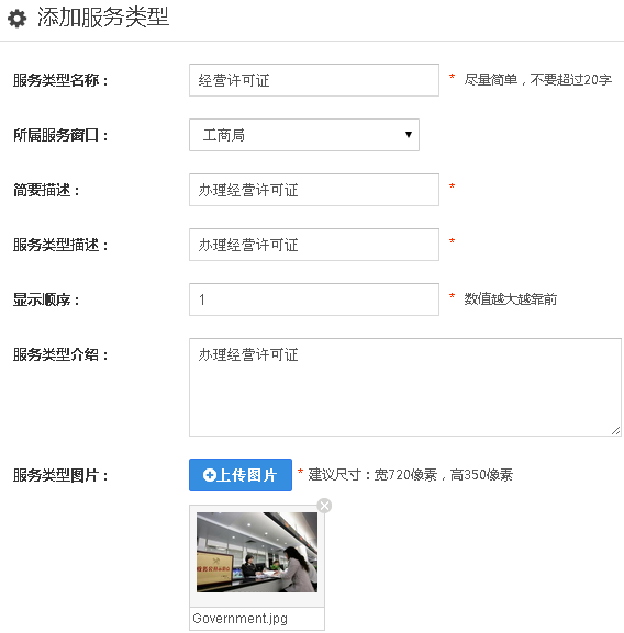 1、点击“服务类型”——“添加服务类型”,编辑服务类型名称,所属服务窗口,简要描述,服务类型描述等等信息,上传服务类型图片,服务类型图片可上传多张。