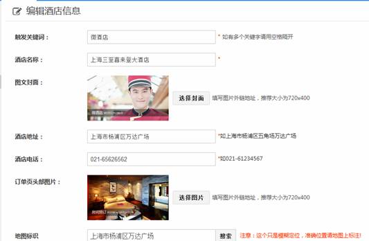 使用方法:1、点击新建订房,进入编辑酒店信息页面,设置触发关键词、酒店名称、上传图文封面、填写酒店地址、酒店电话、上传订单页头部图片、设置地图标识,以实现一键导航功能;