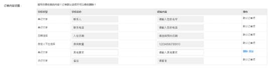 4、订单内容设置:例如:联系人、联系电话、预约日期、选择数量,商家可以根据自己的需求,可对酒店各房间的类型、价格、图片、配套设施进行填写,以供用户针对性的选择房型预订,点击保存