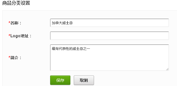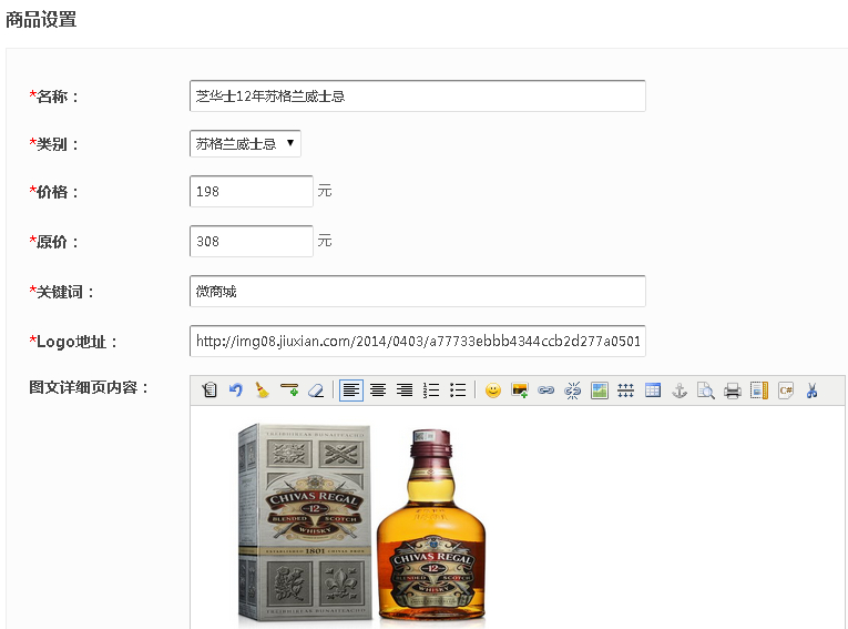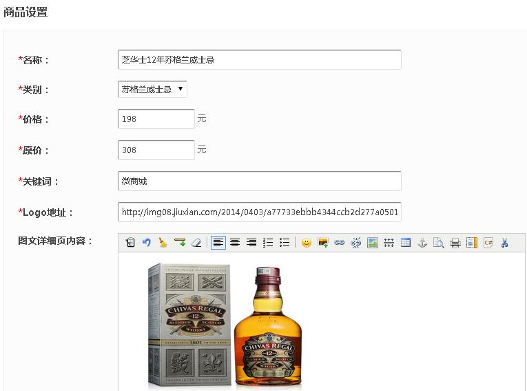 点击“商品管理”——“添加商品”按钮,编辑商品的名称,类别,价格,原价,关键字,logo地址,详细信息等内容。