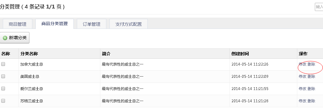 打开分类管理页面,可以对分类进行“修改”和“删除”操作。