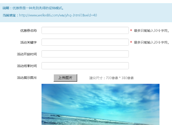 填写优惠券名称、活动关键字、活动开始时间、活动结束时间、活动展示图片、活动简述、活动数量等信息