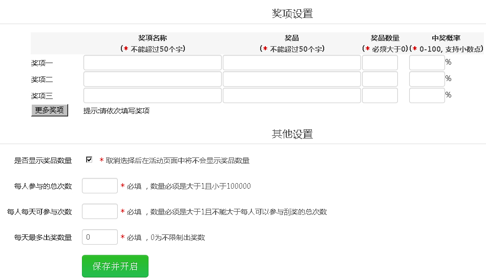 同优惠券一样,刮刮卡中需要填写活动名称、关键字,开始时间,结束时间等等,而且它还需要对奖项进行设置,如下图所示: