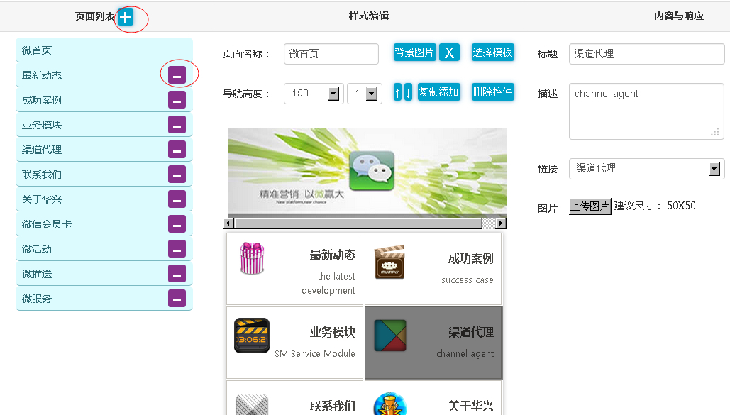 默认只有一个微官网首页,可以通过“+”、“-”增加或减少微官网的页面。