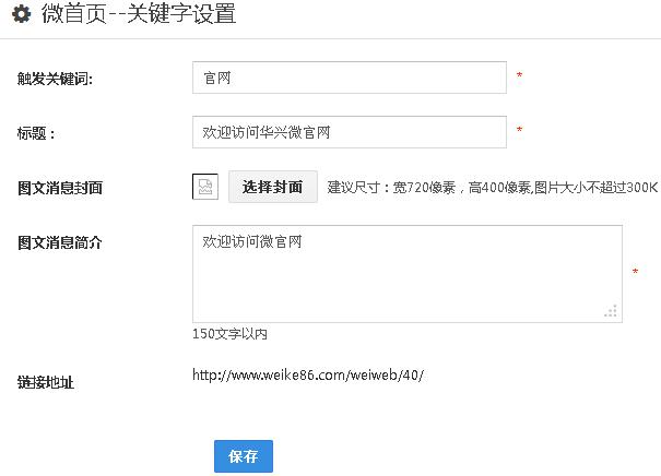 在触发关键词中编辑预设的关键字,此关键字是让客户在平台里直接输入的文字就可弹出进入微官网的推送链接。